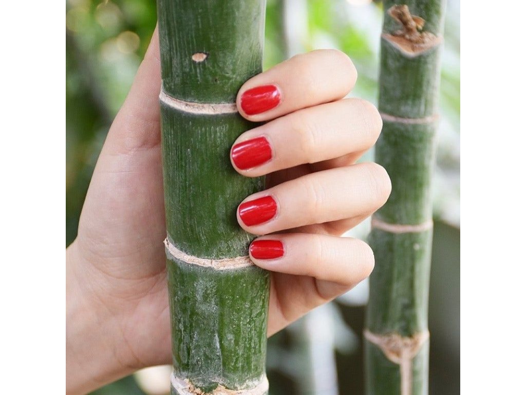Kombinace nadčasové červené na rtech a elegantního laku na nehty pro sváteční příležitosti. Červené tóny spolu ladí tak, aby vytvořily harmonický a elegantní dojem.